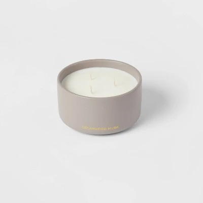 Bring home the soothing aroma of this 15-Ounce Ceramic Jar 3-Wick Black Label Cedarwood Musk Candle from Threshold™. With its sweet woodsy fragrance and simple look, this scented candle is sure to give any room a calming atmosphere as it sits pretty on a shelf or side table. Made with soy wax, paraffin wax and coconut oil, this gray jar candle lasts for about 20 hours, so light it up whenever the mood strikes and make any day special.
