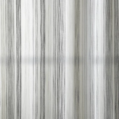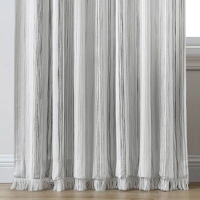 Decorate your windows in fun flair with this Gray Striped Light Filtering Curtain Panel from Threshold™. Adorned with woven vertical stripes in neutral hues with coordinating fringe accents for a decorative look, this striped curtain panel is crafted from a light-filtering fabric that lets in just the right amount of daylight. The lightweight fabric construction and back tab, rod pocket on the top allow for easy hanging and removal, and the machine washable design makes for fuss-free maintenance. Hung in the living room, bedroom or the guest bedroom, this light filtering curtain brings function and style to any room in your abode.