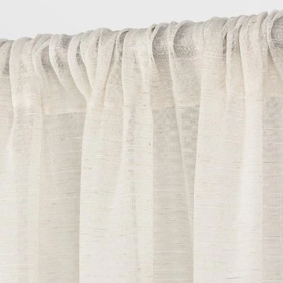 Tying your whole aesthetic together is as easy as hanging this Sheer Linen Curtain Panel from Threshold™. The sheer curtain panel lets natural light come through, making your room feel cheerful and welcoming. It has a rod pocket that makes it easy to pair it with your choice of rod and hardware, and it’s also machine-washable for easy care. You’ll appreciate the ideal finishing touch this sheer panel brings to your space, whether you keep it hanging over the full window for filtered light or drape it behind a tieback to let the sun stream in brightly.