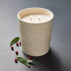 Light the 25oz Ceramic Bay & Winter Berry Candle Cream Candle from Threshold™ designed with Studio McGee to infuse your space with captivating aromas. It features a blend of bay and winter berry scents to create an inviting and cozy atmosphere. Housed in a beautiful ceramic container with a subtle floral pattern, this scented candle effortlessly combines style and fragrance. Enjoy the visual and sensory delight with the Bay & Winter Berry Candle from Threshold™ designed with Studio McGee brings to any room.