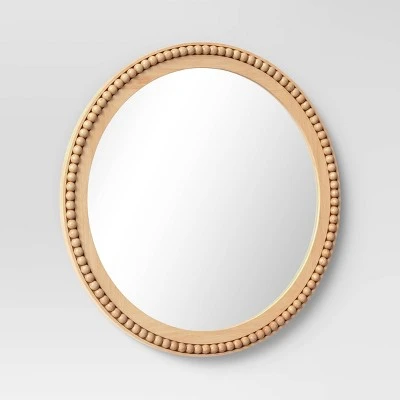 Create an artistic centerpiece on any wall with the Round Wooden Beaded Wall Mirror from Threshold™. This round decorative mirror is enclosed in a light brown wooden frame inlaid with beaded detailing for a touch of visual intrigue. With its striking beauty, this accent mirror brings a room to life and helps brighten up your area by allowing light to bounce around wherever you hang it. Due to lighting and monitor differences, actual colors and finishes may vary slightly from what appears online