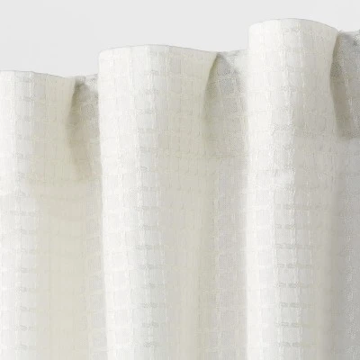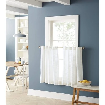 Effortlessly update the style and atmosphere of any room in your home with this Tier Curtains from Threshold™. These half-window curtains features a subtle embroidered grid pattern in white on a white cotton-blend fabric for a clean and sophisticated look. With a light-filtering design that lets a little sun through during the day and a rod pocket at the top for easy hanging, you can combine these embroidered white tier curtains with a valance curtain or use them on their own as a way to create a soft, welcoming environment in any room.