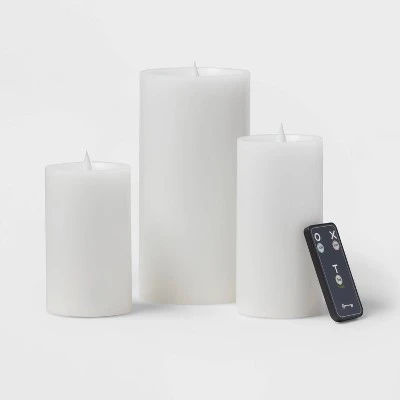 Set up a beautiful candlelit dinner or light up any space of your home with this 3-Pack (3×5 3×6 4×8) of LED Pillar Candles from Threshold™. Made with unscented wax, each piece in this LED pillar candle set has a realistic flame effect to help create just the right mood from a tabletop to every nook and cranny of the home. In a fresh white color, this LED candle set suits a variety of decor styles, and comes in varying sizes for a distinct decorative look, whether you place them together or as solo pieces.
