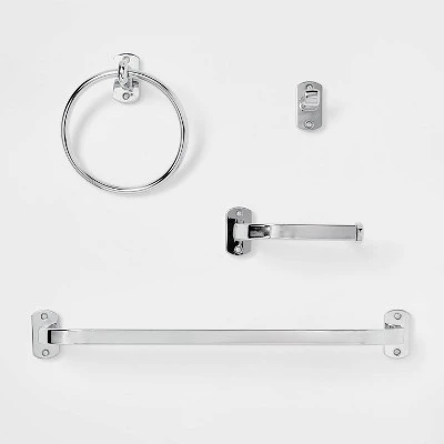 Update the look of your bathroom with this 4-Piece Bath Hardware Set from Threshold™. This four-piece bath hardware set includes with a robe hook, a towel ring, a toilet paper holder and a towel bar to bring functionality to your bath space. Made from metal, each piece in this bath hardware set features a wall-mount design for efficient space utilization, making it a great choice for smaller bathrooms. In a solid metal finish, this wall-mount bath hardware set brings simple, chic style to your bathroom that’s easy to incorporate with a variety of decor.