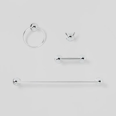 Lend a coordinated finish to your bath decor with this 4-Piece Casual Bath Hardware Set from Threshold™. This four-piece bath hardware set makes a practical addition to your bathroom fittings. It includes a towel bar, toilet tissue holder, towel ring and robe hook with a casual design for a relaxed, easygoing style. The solid stainless steel finish easily coordinates with a range of bath accessories and decor schemes. Plus, the pieces are easy to wall mount and install. You can use them together to bring cohesive flair to your bathroom.