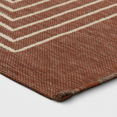 This Geometric Outdoor Rug from Threshold™ pairs easily with a range of contemporary outdoor furnishings. The woven rug features a geometric pattern of abstract concentric shapes in white against a brown background that will stand out wherever you place it. Plus, the rectangular rug boasts a flat-pile design that stands up against heavy traffic areas and is easy to hose clean with water.