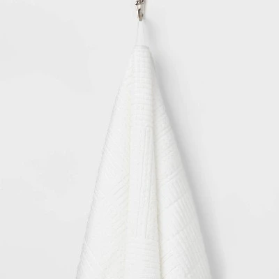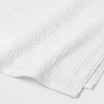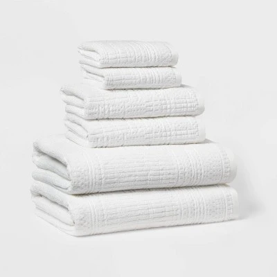 Elevate your bathroom decor with this 6-Piece Modern Towels and Washcloths Set from Threshold™. Made from heavyweight 100% terry cotton fabric, each towel in this set feels soft and allows you to dry off your hands in comfort. This set includes two bath towels, two hand towels, and two washcloths, each featuring a same geometric design on a solid background to add to your modern bathroom aesthetic.