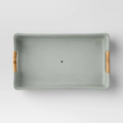 You’re sure to draw attention to the decorative pieces in your backyard, patio, or even indoor setup with this Rectangular Earthenware Tray from Threshold™ designed with Studio McGee. Made from genuine earthenware, this simple but beautiful tray has a soft, heathered green color for a sweet, cozy vibe that’s sure to please guests. The handles are wrapped with rattan for an accent of elegant, textural flair. It’s the perfect place to show off a bouquet of flowers and treasured decorative pieces.