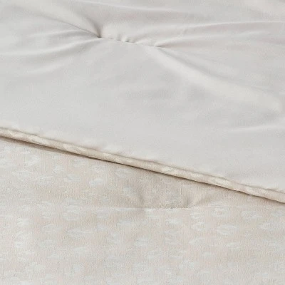 Layer by layer, your bed will look stylish and feel oh-so cozy with this 8-Piece King Luxe Jacquard Snow Leopard Comforter Set from Threshold™. This comforter bedding set includes a soft-filled comforter in light beige jacquard decorated with a snow leopard-spot print, along with a pair of matching pillow shams to create a whimsical, coordinated look. The multi-piece bedding set is finished off with extra flair by two white Euro shams, a beige bedskirt, a beige faux-fur square decorative pillow and a rectangular decorative pillow in beige jacquard with dash stripes and tasseled sides.