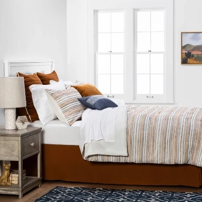 Add unique and stylish stripes to your bed with the Clarksburg Comforter Set from Threshold™. This multi-piece bedding set includes a king comforter, two decorative pillows, two standard shams, two Euro shams and a bedskirt. The soft-filled comforter is adorned with a jacquard striped pattern in brown and blue over a white background that reverses to a solid white on the other side. The eye-catching striped pattern gives this midweight bedding set textural flair, while the shams and coordinating pillows elevate the look, and the mustard bed skirt adds a chic finish.