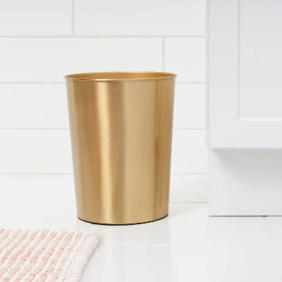 Keep clutter under control while adding a decorative accent to your space with this Antique Wastebasket from Threshold™. This metal wastebasket features a cylindrical silhouette with an open-top design for easy disposal of trash, while the compact size makes it ideal for any room or corner, as well as easy to slide under desks. Showcasing a glossy brass finish, this washroom wastebasket brings rustic-inspired charm to your living space.