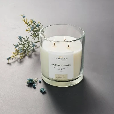 Indulge in earthy, woody and sweet scents of Cypress & Juniper with this Clear Glass Candle from Threshold™ designed with Studio McGee. It is made from soy wax blend with 3 wicks to keep your space smelling great for hours. The clear glass jar easily blends with various decor themes for an elevated and classy look. Create a soothing ambiance with this clear glass cypress and juniper candle from Threshold™ designed with Studio McGee.