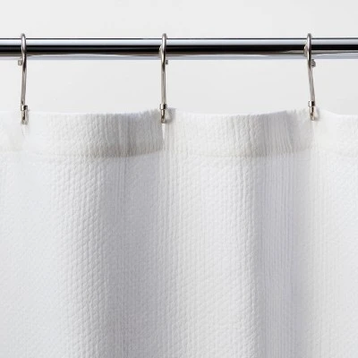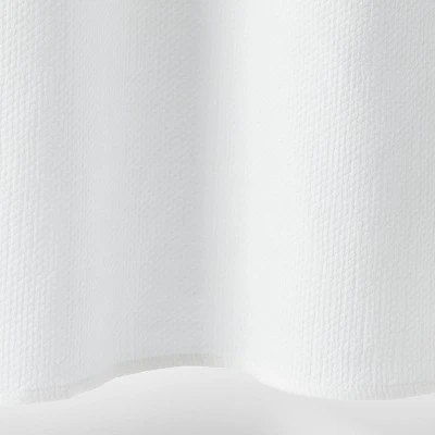 Brimming with elegant style, this Diamond Matelasse Shower Curtain from Threshold™ instantly brings an update to your bathroom decor. Made from 100% cotton that not only feels soft to the touch, but also makes it easy to maintain, this printed shower curtain can be tossed in the washing machine for a quick refresh whenever needed. Plus, the buttonhole top makes it easy to hang around your bathtub or shower stall. Featuring a matelasse construction In a solid white hue, this decorative shower curtain easily blends in with your existing bath decor, while bringing simple style to your daily bath routine. Complete your bathroom decor with matelasse bath or hand towels, and a matching bath rug for a coordinated look.