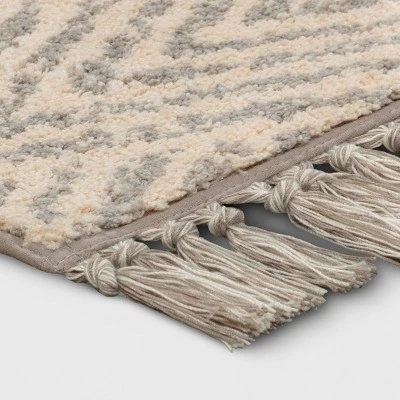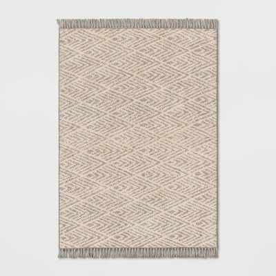 Add textured flair to your indoor space with this Diamond with Fringe Accent Rug from Threshold™. Featuring an allover diamond pattern with tassels on each end, this knitted accent rug blends in easily with your existing decor while adding warmth and texture to your floors. Designed with a latex backing to keep it in place, this fringe accent rug is a highly versatile choice that’s easy to place in your living room, hallway, study and more.