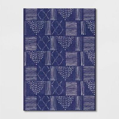 The Dot Geo Outdoor Rug from Threshold™ is great for tossing on the floor of your mudroom, patio, deck or backyard. Made of lightweight material, this rectangular area rug showcases a white woven pattern of broken stripes and dotted geometric shapes on an indigo background for a fun look. The woven area rug sports a flat-pile construction that allows for easy maintenance and effortless placement, along with spray latex backing to help keep it in place wherever you choose to spread it.