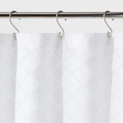 Refresh your bathroom with the clean and classy look of this Dyed Clipped Diamond Shower Curtain from Threshold™. Crafted from 100% cotton fabric, this diamond-patterned shower curtain comes in a neutral white shade with subtle dyed clipped diamond-shaped details for an elegant and spa-worthy textured look. A perfect addition to any bathroom in your home, this white shower curtain comes with a buttonhole top that allows for easy hanging with the hardware of your choice. We’re committed to making products better for you, and the world. This product is Standard 100 by OEKO-TEX certified, meaning that everything from the dyes and fabrics to accessories like buttons and zippers are tested and verified as free from harmful levels of more than 300 substances.
