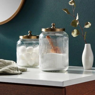 Add a touch of traditional style to your bath space with the Large Bath Glass Canister from Threshold™. This large bath canister features a jar-like shape with a brass-finish lid for a beautiful look. The canister is made with glass and features a ribbed design to add an appealing look to your bathroom decor. You can use the glass bath canister to store cotton buds or any other item — just add a small bath canister to create a coordinating look in your bathroom.