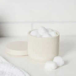 Maintain a tidy bathroom in style with this Sand Modern Resin Canister from Threshold™. It showcases a cream color with a ribbed finish to bring a touch of modern texture and style. The practical canister is great for storing cotton balls, swabs, makeup accessories and other small essentials. It comes with a top lid that keeps contents secure and dust-free. You can pair with similar items from the same collection to complete your coordinated bathroom set.