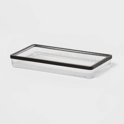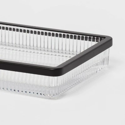 Maintain a clutter-free bathroom with this Ribbed Glass Tray from Threshold™. Designed in a rectangular silhouette, this glass bath tray features raised edges that help keep small vanity items or bottles contained. Showcasing a ribbed glass finish with a metallic black rim, it’s sure to bring sleek style to your bathroom decor.
