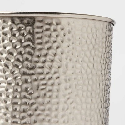 Both stylish and useful, this Solid Hammered Wastebasket from Threshold™ helps keep your master bath or guest bathroom neat and tidy. Constructed from sturdy iron for long-lasting use, this solid wastebasket features a textured hammered design allover that lends your space a touch of chic flair while matching well with any existing decor. Dress up your bathroom with functional style with the help of this hammered metal wastebasket.