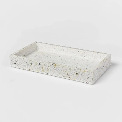 Keep small accessories or hair and skincare products neatly organized with this Terrazzo Bathroom Tray from Threshold™. This rectangular bathroom tray is made with terrazzo material that creates a unique appearance, with chips of green, blue, gray and light-blue poured together with a white material to create a sleek, modern look. The raised edges help keep your small items or bottles contained, while the smooth design is easy to clean to keep it looking fresh.